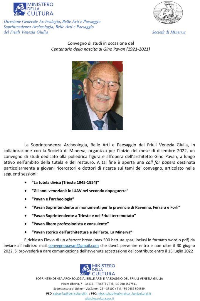E’ aperta la call for papers per il convegno di studi organizzato in occasione del Centenario della nascita di Gino Pavan (1921 – 2021) in programma a Trieste i prossimi 1 – 2 dicembre 2022.