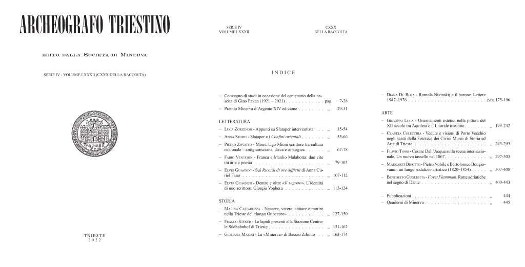 L’edizione 2022 dell’Archeografo Triestino (serie IV – volume LXXXII / CXXX della raccolta) accoglie i contributi dedicati a Scipio Slataper a cura di Luca Zorzenon e Anna Storti, Pietro Zovatto dedica una ricerca a Mons. Ugo Mioni mentre Franca e Manlio Malabotta sono i protagonisti del testo di Fabio Venturin. Elvio Guagnini, invece, approfondisce gli scritti di Anna Curiel Fano e Giorgio Voghera. Marina Cattaruzzaesamina il tema di “Nascere, vivere, abitare e morire nella Trieste del «lungo Ottocento»“, lo studio di Franco Stener riguarda “Le lapidi presenti alla Stazione Centrale Südbahnhof di Trieste”. “La «Minerva» di Baccio Ziliotto” è il tema presentato da Giuliana Marini, mentre “Romola Nizinskij e il barone. Lettere 1947–1976” è quello trattato da Diana de Rosa. Per quanto riguarda i temi artistici nell’Archeografo 2022 vi si ritrovano lo studio di Giovanni Luca dedicato agli “Orientamenti estetici nella pittura del XII secolo tra Aquileia e il Litorale triestino” e il testo di Claudia Colecchia “Vedute e visioni di Porto Vecchio negli scatti della Fototeca dei Civici Musei di Storia ed Arte di Trieste”. Flavio Tossi scrive, invece, di “Cesare Dell’Acqua sulla scena internazionale. Un nuovo tassello nel 1867”, mentre Margaret Binotto dedica il suo pezzo a “Pietro Nobile e Bartolomeo Bongiovanni: un lungo sodalizio artistico (1820–1854)”. Infine, Benedetto Gugliotta narra di “Fovet Flammam. Rotte adriatiche nel segno di Dante”.