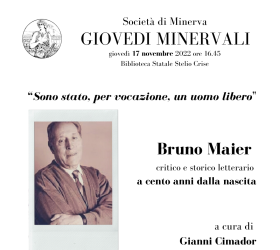 giovedì 17 novembre 2022 dalle 16.45 alla Biblioteca Statale Stelio Crise   “Sono stato, per vocazione, un uomo libero”. Bruno Maier – critico e storico letterario – a cento anni dalla …